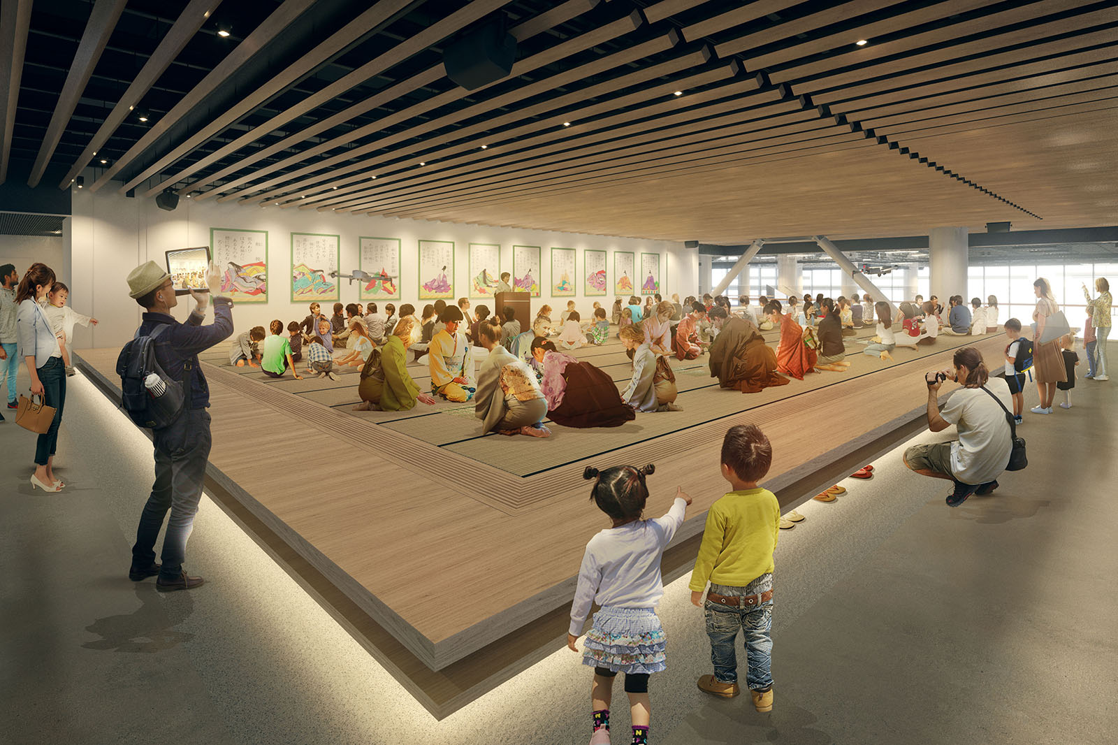 靴をぬいでくつろげる、約100畳の畳のスペース。和の文化とテクノロジーを掛け合わせた、ユニークな体験をお楽しみいただけます。